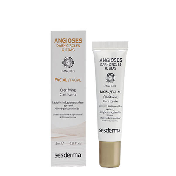 Angioses Contorno de Ojos indicado para todo tipo de piel. Es un tratamiento antiojeras, aclarante, antioxidante y antiedad. Gracias a su tecnología Sistema lactoferrina-lactoperoxidasa, retinol, vitamina C, superoxida dismutasa, complejo venoprotector y antiinflamatorio encapsulado en liposomas. Actúa a través de los nanosomas que libera gradualmente sus activos. Los nanosomas además de liberación gradual, se va mejorando la circulación donde se refuerzan los capilares para facilitar la reabsorción de la sangre y por ende mejora en un alto grado la apariencia de las ojeras.